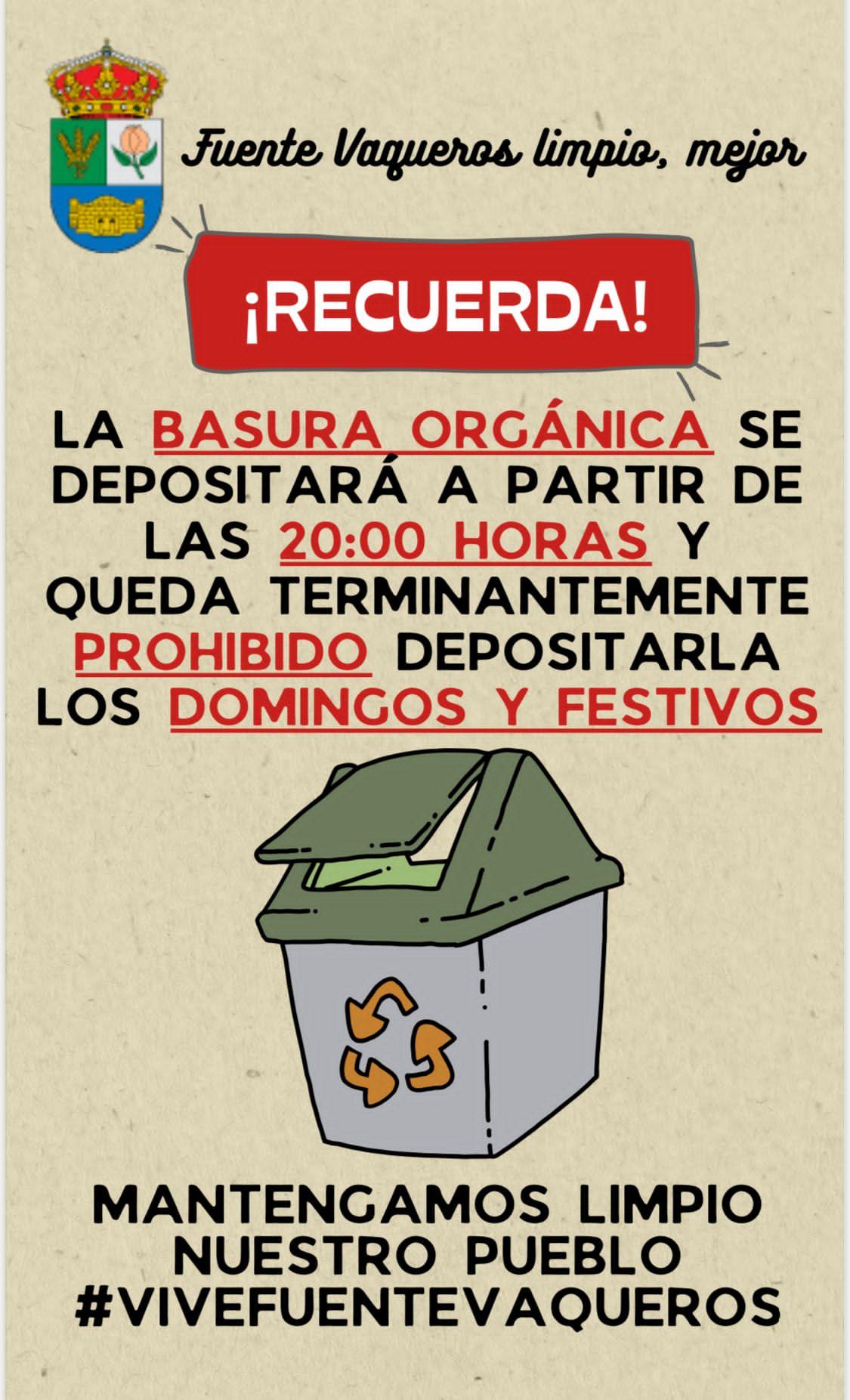 ‼️HORARIO PARA DEPOSITO DE BASURA ORGÁNICA, MOBILIARIO Y ENSERES‼️-Fuente Vaqueros