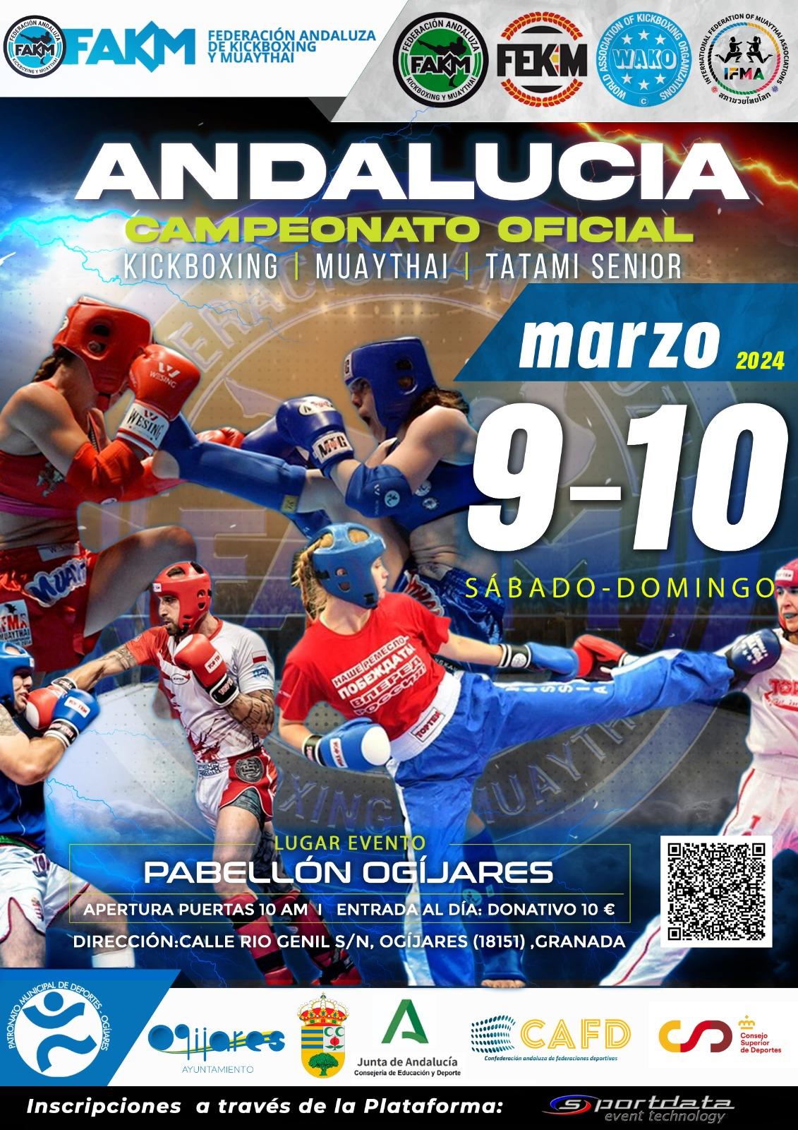 Los días 9 y 10 de marzo tendrá lugar el Campeonato Oficial de Andalucía de Kickboxing, Muaythai, Tatami Senior