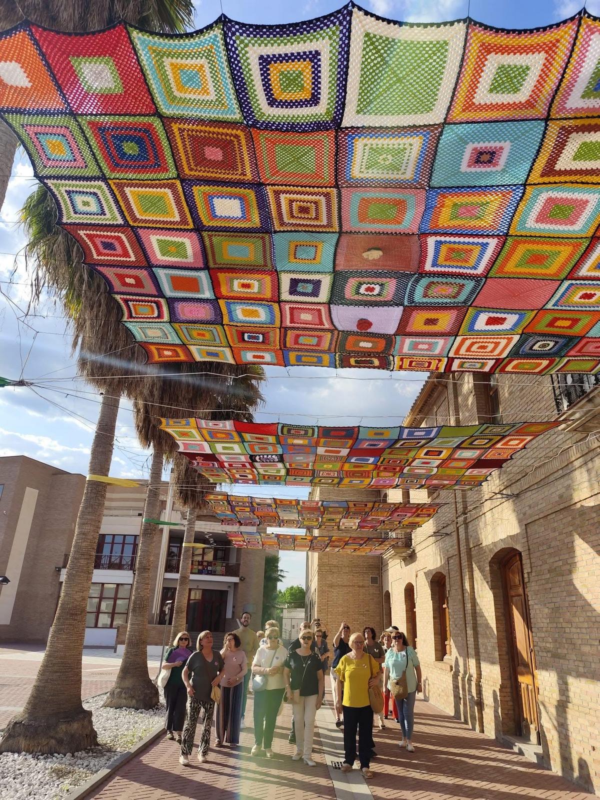 El Taller de Lanas y Libros de Fuente Vaqueros tiene el placer de invitaros a disfrutar del resultado de nuestro trabajo colectivo: el nuevo toldo que adorna la Plaza del Teatro, acompañado de coloridos adornos que llenan de vida este rincón tan especial de nuestro pueblo.