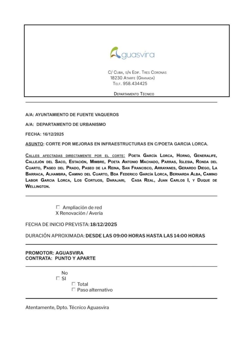 ⚠️Corte Parcial de Agua en FUENTE VAQUEROS por mejoras en las infraestructuras en la C/ Poeta Garcia Lorca⚠️