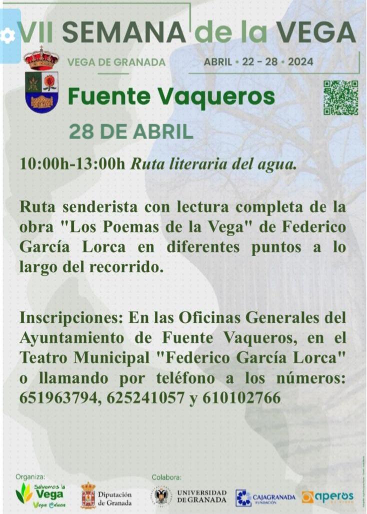 La Diputación de Granada y diversos Ayuntamientos de la provincia, junto la plataforma “Salvemos la Vega – Vega Educa”, organizan del 22 al 28 de abril la VII edición de la Semana de la Vega, en la que participarán once ayuntamientos del entorno de la vega granadina, entre ellos Fuente Vaqueros. Un evento anual que tiene objetivo común de luchar por la defensa de los valores sociales, culturales, medioambientales y patrimoniales de la Vega de Granada y su entorno.