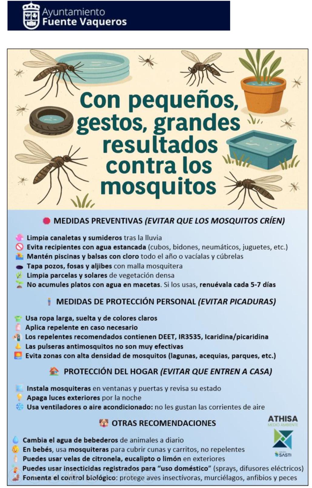El mosquito es el principal transmisor del Virus del Nilo Occidental, que puede afectar gravemente la salud. Desde el Ayuntamiento de Fuente Vaqueros, te pedimos tu colaboración para reducir su presencia y protegernos entre todos.